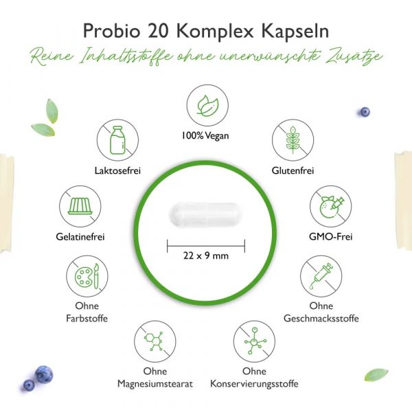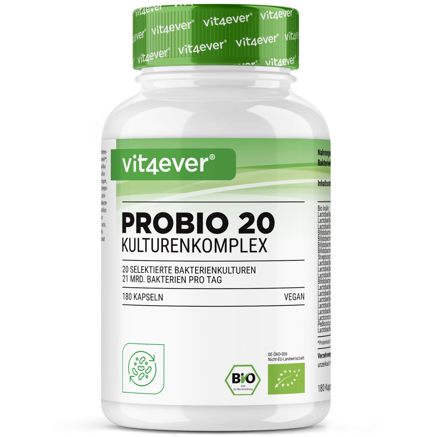 - Κάθε κουτί περιέχει 180 κάψουλες με 20 επιλεγμένες βακτηριακές καλλιέργειες & οργανική ινουλίνη. 21 δισεκατομμύρια CFU ανά ημερήσια δόση (2 κάψουλες). Συμπεριλαμβανομένων των πρεβιοτικών. Το Probio 20 περιέχει Lactobacillus, Bifidobacterium, Acidophilus, που αποικίζουν το έντερο, δηλαδή την εντερική χλωρίδα.