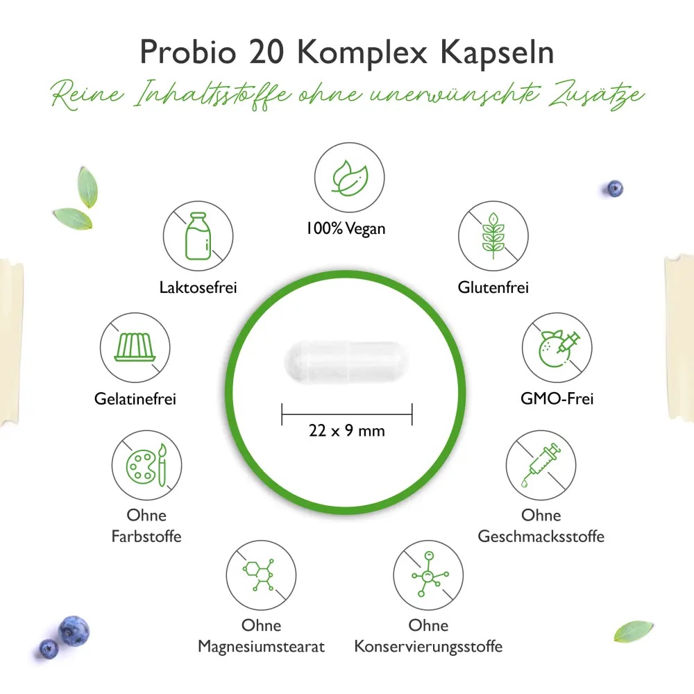 Το σύμπλεγμα Probio 20 περιέχει 20 διαφορετικά και τέλεια συντονισμένα βακτηριακά στελέχη. Με την προσθήκη Bio Inulin, που λαμβάνεται από τη ρίζα κιχωρίου, οι βακτηριακές καλλιέργειες μπορούν να ξεδιπλωθούν ακόμη καλύτερα, καθώς η ινουλίνη είναι ιδανικό έδαφος αναπαραγωγής για όλα τα βακτήρια. Προκειμένου τα βακτηριακά στελέχη να ξεδιπλώσουν την πλήρη δράση τους χωρίς απώλεια, είναι σημαντικό τα βακτήρια να μην έχουν ήδη χωνευτεί στο στομάχι. Το σύμπλεγμα Probio 20 είναι ειδικά εξοπλισμένο με γαστροανθεκτική κάψουλα (Bright JC Capsl) από gellan. Τα φωτεινά καλύμματα JC προστατεύουν τα βακτήρια από το οξύ του στομάχου και εξασφαλίζουν χρονικά καθυστερημένη απελευθέρωση, η οποία λαμβάνει χώρα μόνο στο λεπτό έντερο.