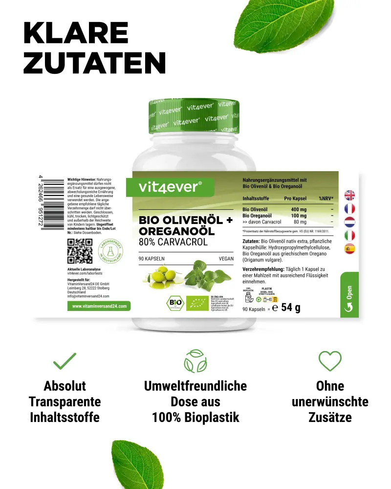 Συστατικά: Βιολογικό εξαιρετικό παρθένο ελαιόλαδο, φυτικό κέλυφος κάψουλας: υδροξυπροπυλομεθυλοκυτταρίνη, βιολογικό έλαιο ρίγανης από ελληνική ρίγανη.